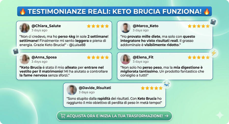 Se stai cercando un modo naturale ed efficace per accelerare la combustione dei grassi e supportare la tua dieta chetogenica, Keto Brucia è l’integratore che può trasformare il tuo percorso di benessere. Scopri perché sempre più persone scelgono Keto Brucia come alleato quotidiano per ottenere risultati reali e duraturi sulla silhouette, senza sacrifici estremi o stress inutili.